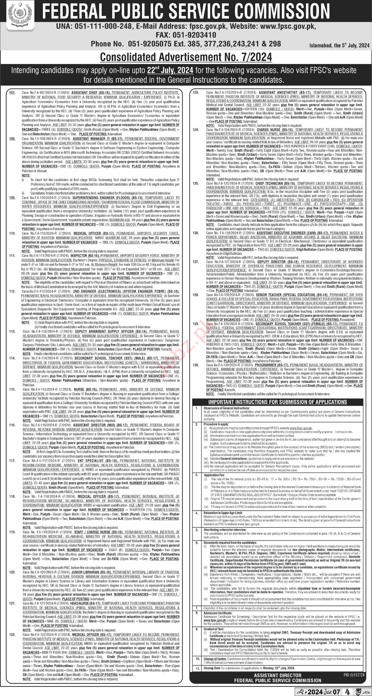 Vacant posts including medical officer, inspector, superintending engineer, teacher special education, second engineer electronics, deputy director, chief technician, head nurse, assistant director mis, programmer, ent specialist, assistant executiv engineer, deputy armament supply officer, staff nurse, charge nurse, female secondary school teacher, male secondary school teacher sst, nurse, assistant anesthetist, assistant manager, assistant chief and librarian are announced in Federal Public Service Commission FPSC Islamabad, islamabad Islamabad Pakistan as per 7 July 2024 advertisement in daily Aaj Newspaper. B.E, Mphil, Phd, MS, MCS, MIT, MBBS, Master, B.ed, MA and Bachelor etc. educational qualification will be preferred.