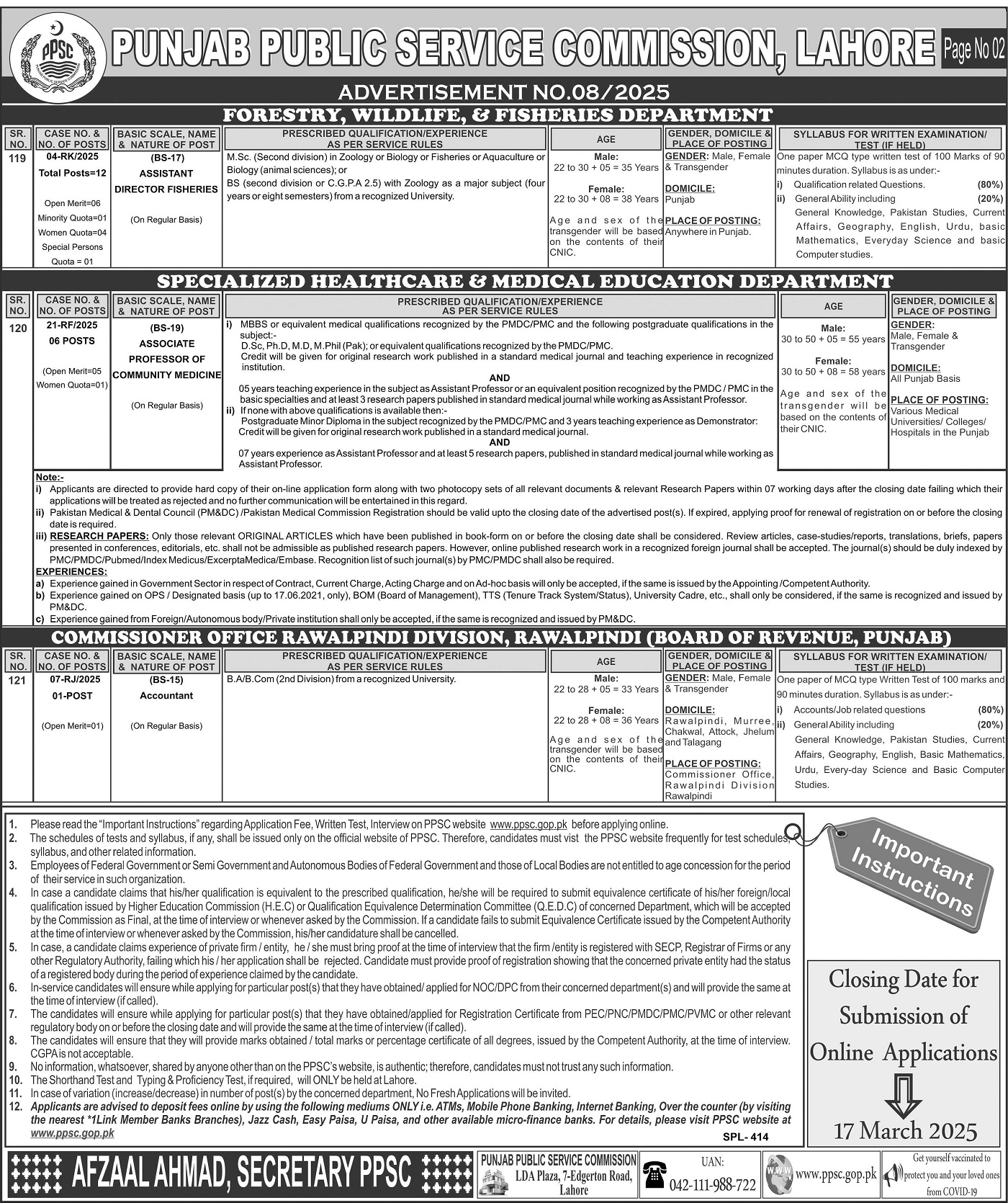 Punjab Public Service Commission PPSC Egerton Road Lahore, lahore Punjab Pakistan invites applications from eligible candidates for the post of sub engineer, curator, stenographer, qms manager, survey drawing officer, clerk, statistical officer, assistant director assessment collection, evaluation officer, associate professor of community medicine, research officer, accountant, economist and assistant director fisheries as per advertisement of March 2, 2025 published in daily Dunya Newspaper. Persons with MBA, DAE, Intermediate, Mphil, B.com, Master, MA, MBBS, M.sc, BA and Matric etc. education can apply.