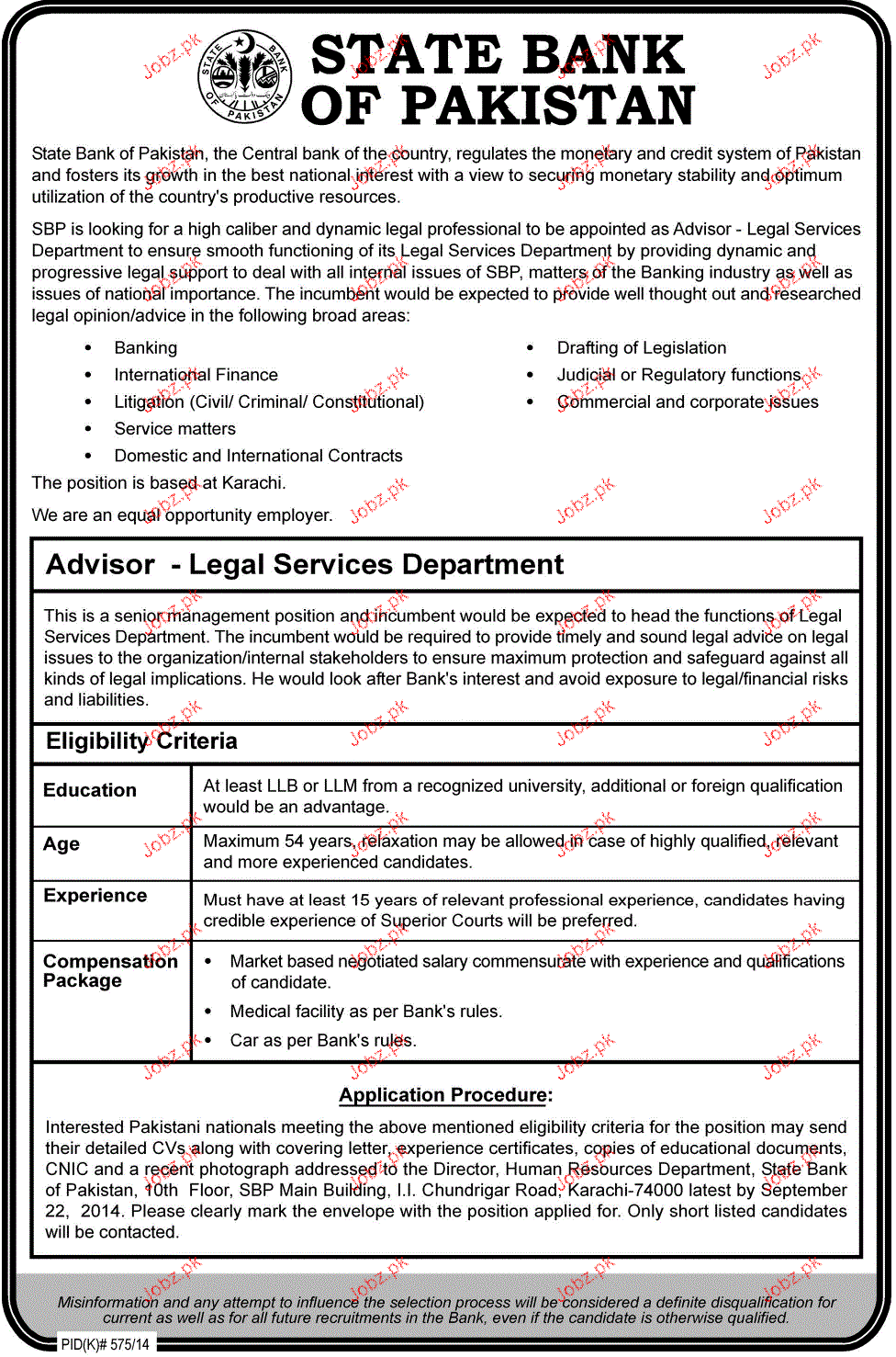Advisor Legal Service Department Job In State Bank Of Pakist