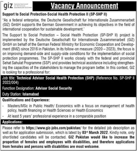 Vacancies in GIZ Pakistan Advertisement February 2022