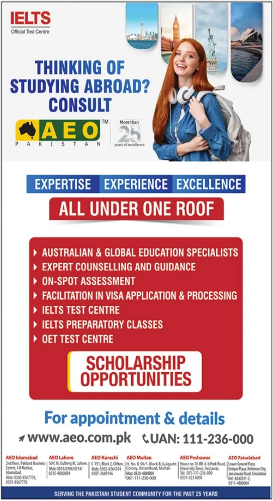 Admissions in AEO Pakistan Testing Centre 2024 for Bachelor, Master has been announced. Eligible students who qualify as per admission criteria in AEO Pakistan Testing Centre Islamabad Lahore Islamabad Pakistan can apply in Teaching University for academic year 2024. Students who want to enroll for academic session 2024 in Master and Bachelor qualification and admission criteria for Private institute can apply till last date. Read newspaper ad for exact details.