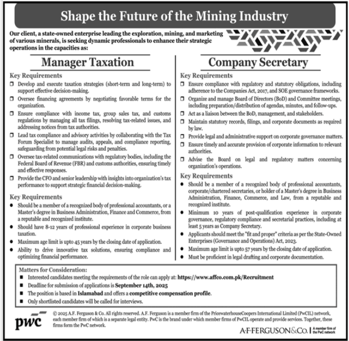 AF Ferguson & Co latest Private Management jobs and others can be applied till September 14, 2025 or as per closing date in newspaper ad. Read complete ad online to know how to apply on latest AF Ferguson & Co job opportunities.