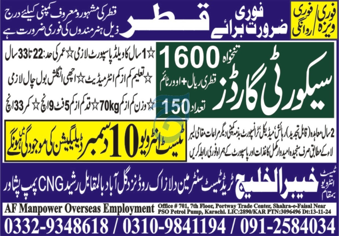 AF Manpower Overseas Employment Promoters invites applications for job positions advertised in daily Aaj dated 8 December 2024 for following vacancies in Doha, doha Qatar.