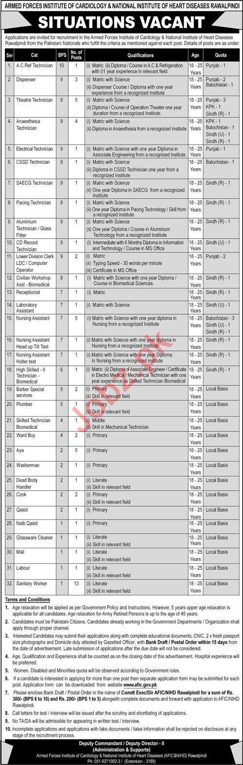 Armed Forces Institute of Cardiology and National Institute of Heart Diseases AFIC NIHD Rawalpindi, Pakistan Army, Government of Pakistan is seeking candidates for the posts of AC Ref Technician, Dispenser, Theater Technician, Anaesthesia Technician, Electrical Technician, CSSD Technician, SAECG Technician, Packing Technician, Aluminium Technician, Glass Fitter, CD Record Technician, Lower Division Clerk, LDC, Computer Operator, Civilian Workshop Assistant Biomedical, Receptionist, Laboratory Assistant, Nursing Assistant, Plumber, Ward Boy, Aya, Washer Man, Cook, Naib Qasid, Mali, Labour, Sanitary Worker.