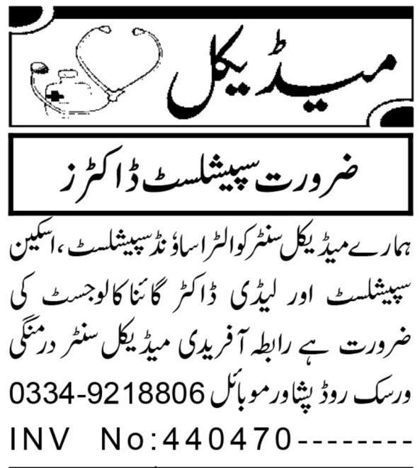 Afridi Medical Center jobs advertisement dated about 11 April 2025 in daily Aaj Newspaper invites application for the vacant post of lady doctor, gynecologist, doctor, skin specialist and ultrasound specialist in Warsak Road Peshawar, peshawar Khyber Pakhtunkhwa KPK Pakistan. Educational qualifications required MBBS etc.