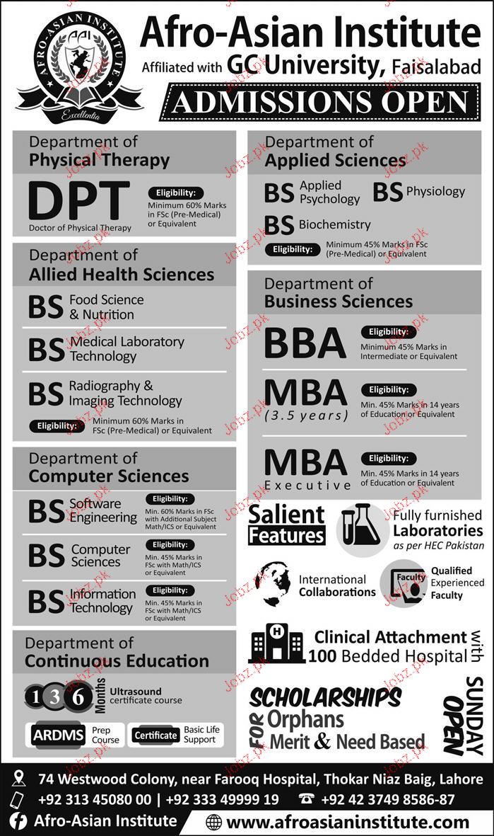 Afro Asian Institute Admission in DPT, BS and MBA in Lahore. Read newspaper ad for exact details.
