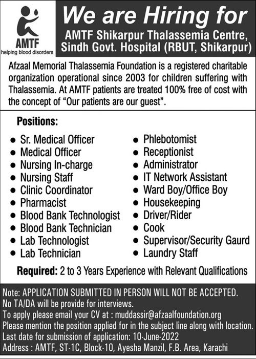 Afzaal Memorial Thalassemia Foundation Shikarpur, shikarpur Sindh Pakistan invites applications from eligible candidates for the post of phlebotomist, blood bank technologist, lab technologist, lab technician, nursing incharge, housekeeping, administrator, office boy, cook, pharmacist, driver, supervisor, nursing staff, security guard, laundry staff, it network assistant, ward boy, blood bank technician, receptionist, medical officer, clinic coordinator and rider as per advertisement of June 3, 2022 published in daily Kawish Newspaper. Educational qualifications required MBBS, Primary, Intermediate, B Pharmacy, Middle, Others, Matric and Pharma D etc.