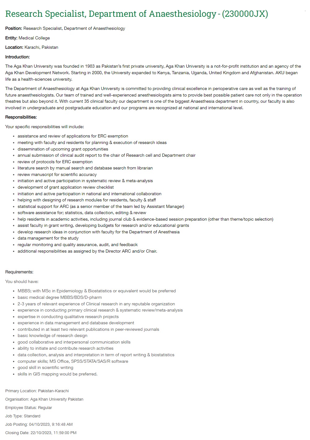 Aga Khan University invites applications for job positions advertised in daily Other dated 7 October 2023 for following vacancies in Karachi, karachi Sindh Pakistan.
