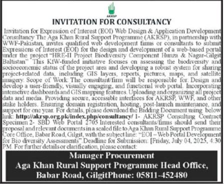 Vacant posts including expression of interest are announced in Aga Khan Rural Support Programme Gilgit, gilgit Gilgit Baltistan Pakistan as per 20 June 2025 advertisement in daily K2 Newspaper. Educational qualifications required Bachelor etc.