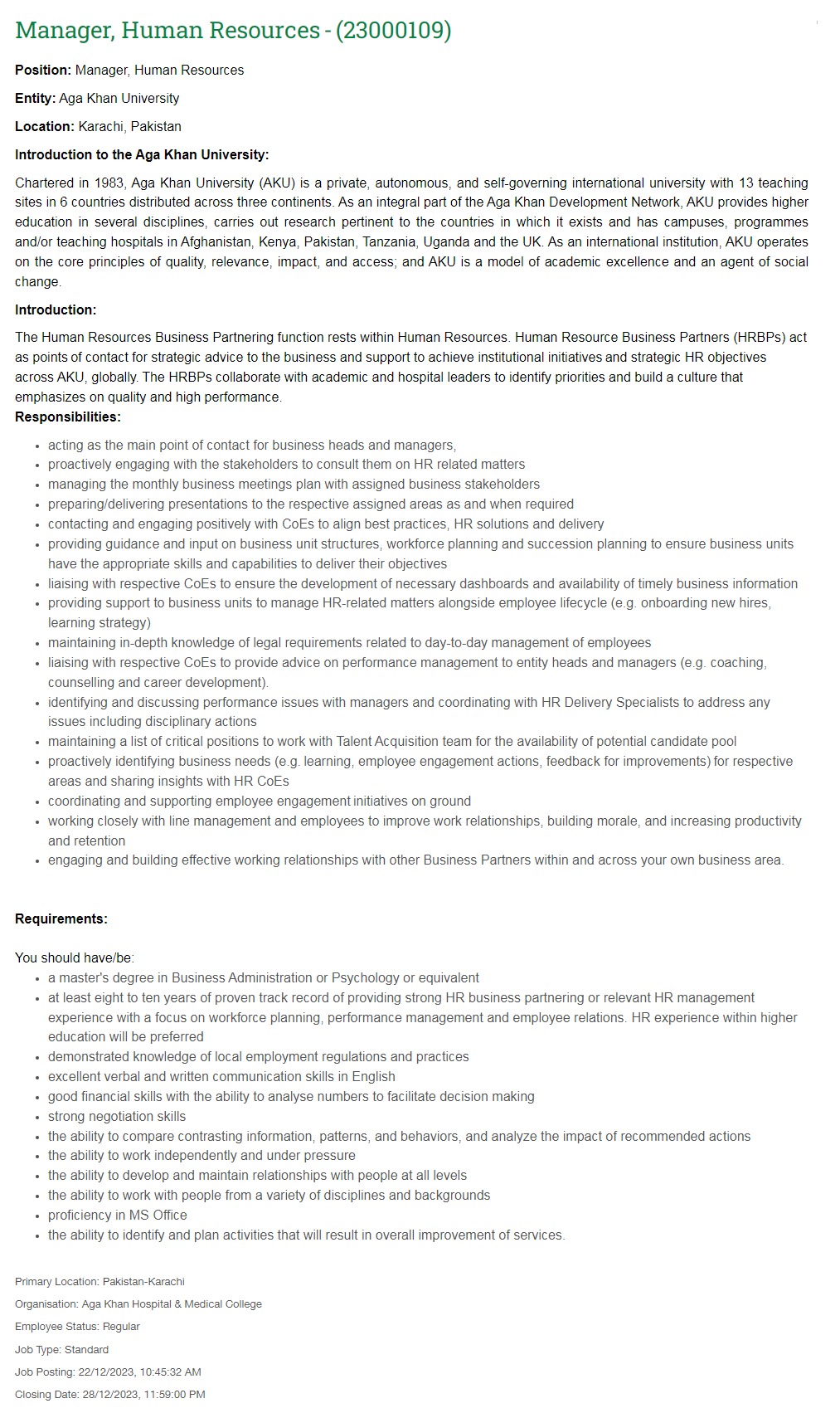 Latest Human Resource jobs and others Private jobs in Aga Khan University closing date is around December 28, 2023, see exact from ad. Read complete ad online to know how to apply on latest Aga Khan University job opportunities.