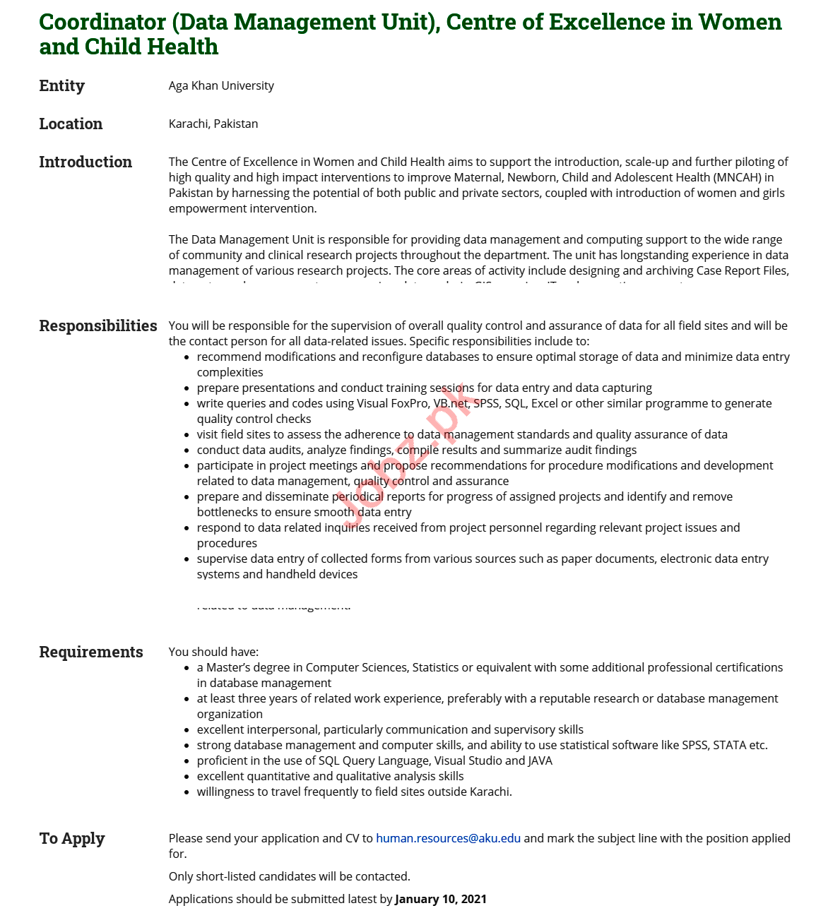Aga Khan University Hospital AKUH Jobs 2021 For Coordinator