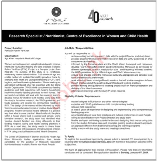 Aga Khan University Rahim Yar Khan, rahim yar khan Punjab Pakistan invites applications from eligible candidates for the post of research specialist and nutritionist as per advertisement of December 24, 2023 published in daily Jang Newspaper. Preferred Education is Master, Bachelor, Phd and Mphil etc.