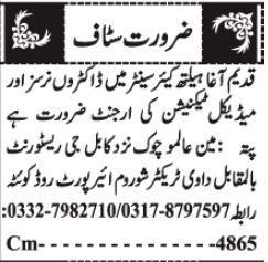 Private Hospital invites applications for job positions advertised in daily Jang dated 29 May 2024 for following vacancies in Quetta, quetta Balochistan Pakistan.