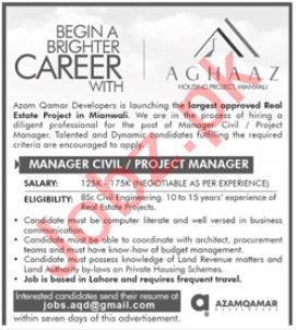 Aghaaz Housing Project Lahore Jobs 2020 For Manager