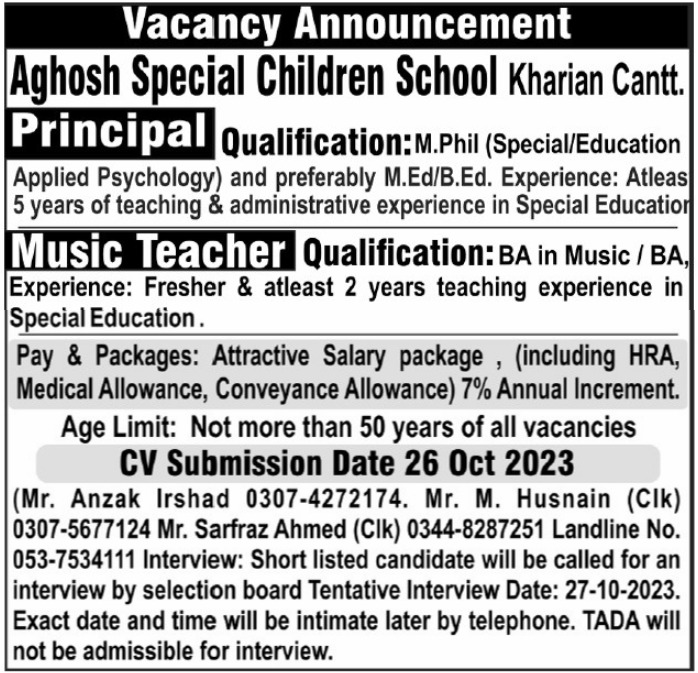Aaghosh Special Children School jobs advertisement dated about 21 October 2023 in daily Express Tribune Newspaper invites application for the vacant post of teacher, principal and music teacher in Kharian, kharian Punjab Pakistan. Preferred Education is Bachelor and Master etc.