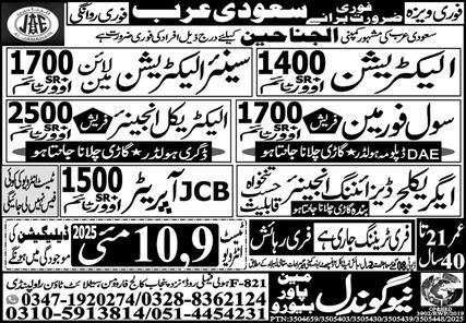 MS New Gondal Manpower Bureau OEP invites applications for job positions advertised in daily Express dated 8 May 2025 for following vacancies in Riyadh, taif Saudi Arabia.