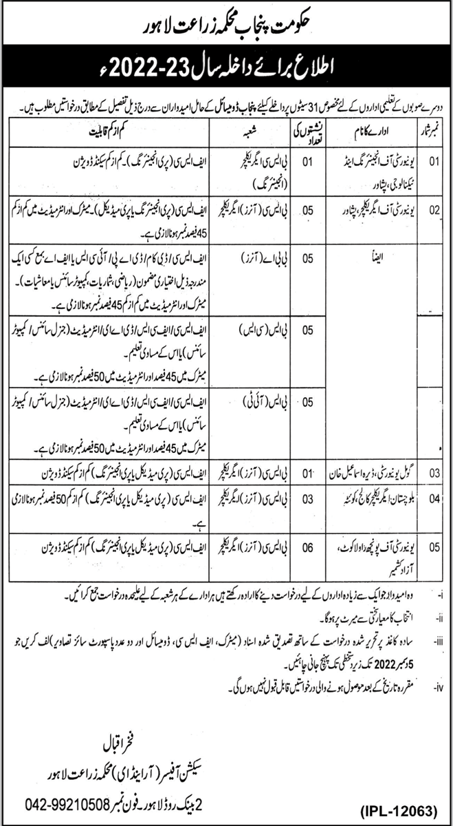 Agriculture Department BS in Agriculture Engineering, BSc Hons in Agriculture, BBA Hons, BSCS, BSIT, BS Hons Agriculture admissions 2022 has been announced. Students who want to take admissions in Agriculture Department Lahore Punjab Pakistan for academic year 2022 to continue education in Science University can apply. Students for admissions in BSc Hons, BBA and BS can apply for online or campus classes as per Government institute criteria till admission closing date December 5, 2022. Read newspaper ad for exact details.
