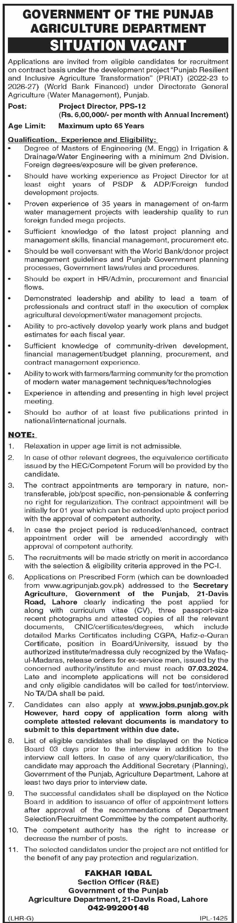 Vacancies in Agriculture Department Advertisement February 2024