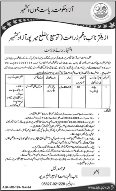 Agriculture Extension Department is looking for candidates for following posts as per job advertisement published in daily Dunya Newspaper of April 5, 2024 for location Mirpur, mirpur AJK Pakistan: