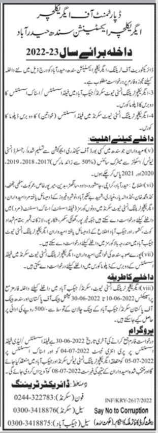 Agriculture Department admissions 2022 for Field Assistant Diploma for Women has been announced. Eligible students can apply for academic admissions 2022 in Agriculture Department Sakrand Jacobabad Sindh Pakistan for Science Course. Students for admissions in Diploma can apply for online or campus classes as per Government institute criteria till admission closing date June 30, 2022. Read newspaper ad for exact details.