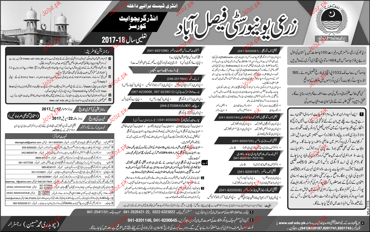 Agriculture University Faisalabad Admission in Undergraduate in Faisalabad. Read newspaper ad for exact details.
