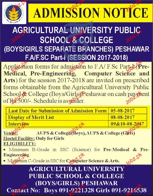 Agriculture University School Admission in Fsc in Peshawar. Read newspaper ad for exact details.