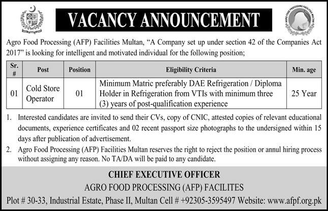 Agro Food Processing AFP, Public Sector Company jobs advertisement dated about 11 May 2023 in daily Express Newspaper invites application for the vacant post of cold store operator in Multan, multan Punjab Pakistan. Preferred Education is DAE and Matric etc.