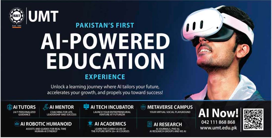 UMT Sialkot admissions 2025 for AI has been announced. Students who want to take admissions in UMT Sialkot Sialkot Punjab Pakistan for academic year 2025 to continue education in Science College can apply. Students for admissions in & criteria can apply as per Government institute admission policy 2025 before closing date as per advertisement. Read newspaper ad for exact details.