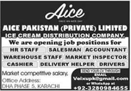 Aice Pakistan Private Limited jobs advertisement dated about 27 October 2024 in daily The News Newspaper invites application for the vacant post of delivery helper, driver, warehouse staff, accountant, htv driver, ltv driver, salesman, market inspector, hr staff and cashier in Karachi, karachi Sindh Pakistan. Candidates with Intermediate, Bachelor, Matric and Master etc. educational background will be preferred.