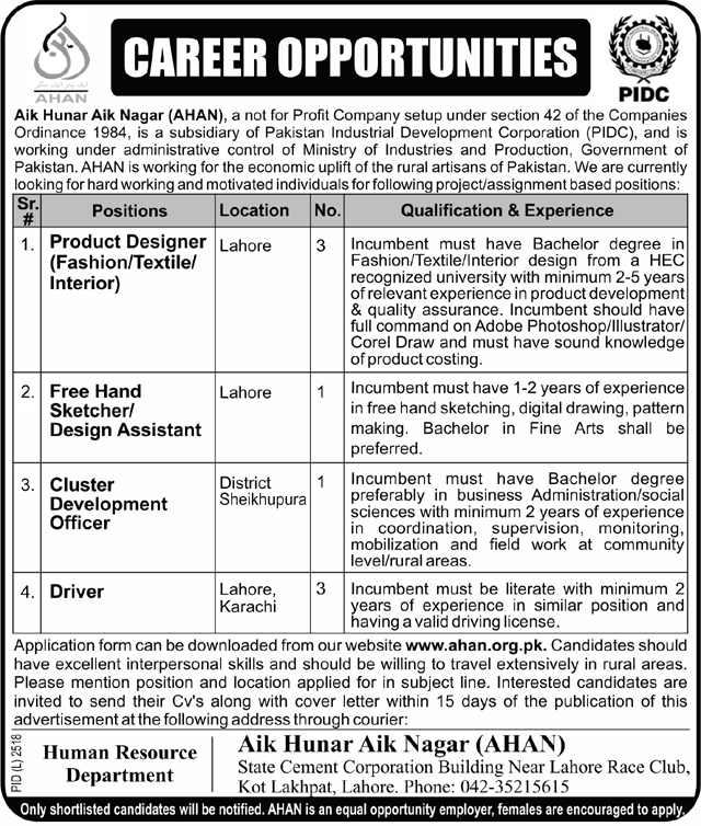 Aik Hunar Aik Nagar (AHAN), a non for profit company need highly qualified and well educated individuals for the posts of Product Designer, Free Hand Sketcher/Design Assistant, Cluster Development Officer, Driver in Lahore, Punjab. The suitable individuals apply as per given criteria.