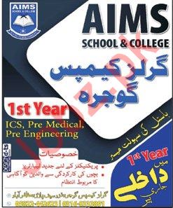 AIMS School & College Girls Campus has announced admissions for 1st Year, ICS, Pre Medical & Pre Engineering in Gojra Muzaffarabad Azad Jammu & Kashmir AJK 2019. Read newspaper ad for exact details.