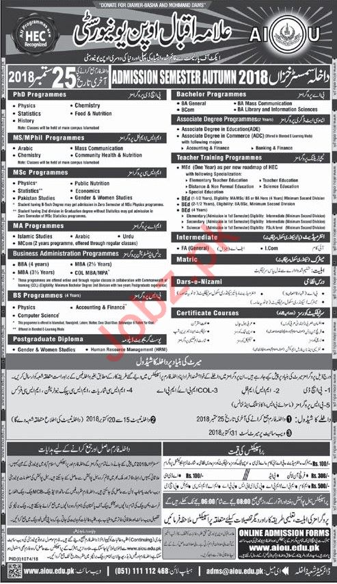 AIOU Allama Iqbal Open University admissions open for PhD, Bachelor, Associate Degree Programmes, MS/M.Phil, MSc, Teacher Training, MA, Business Administration, Matric, Intermediate, Dars-e-Nizami, Certificate Courses, BS, Postgraduate Diploma Programmes 2018. Read newspaper ad for exact details.