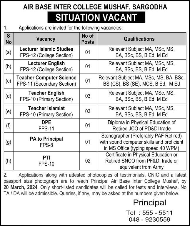 Vacancies in Air Base Inter College Mushaf Advertisement March 2024