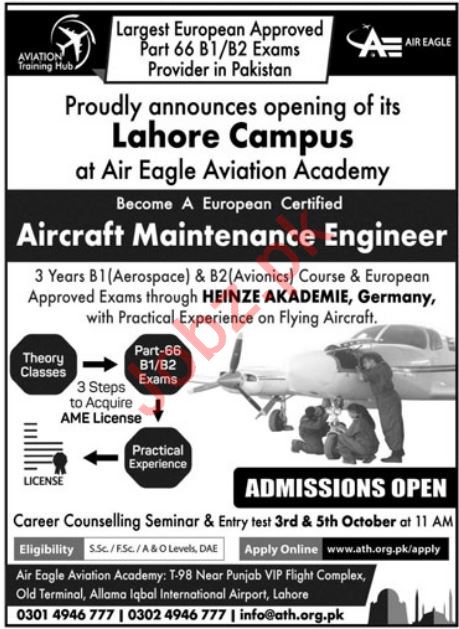 Aviation Training Hub, Air Eagle Aviation Academy a project of Shaheen Foundation, Pakistan Air Force PAF proudly announces admissions for Aircraft Maintenance Engineer Diploma in Lahore Campus. Read newspaper ad for exact details.