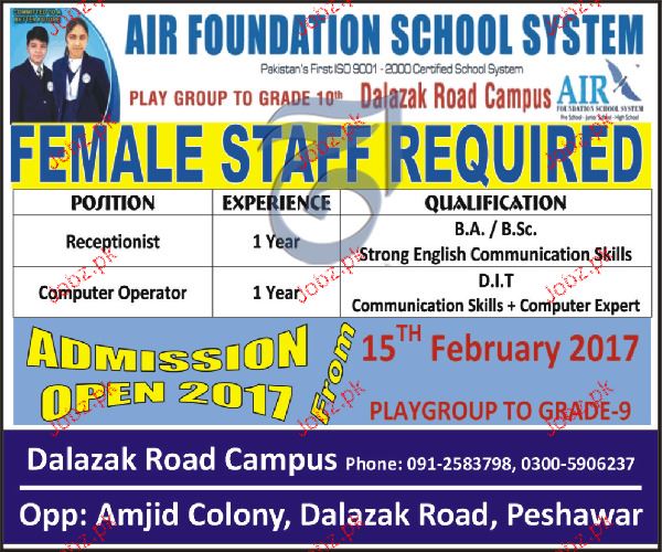 Air Foundation School System Admission in Playgroup to IX in Peshawar. Read newspaper ad for exact details.