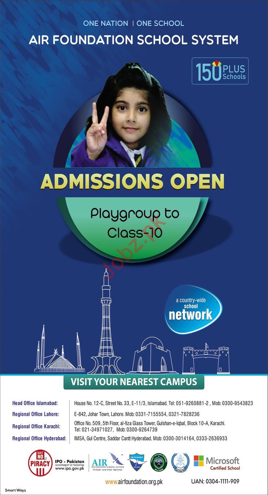 Air Foundation School System is offering admissions in Playgroup, Class I, Class II, Class III, Class IV, Class V, Class VI, Class VII, Class VIII, Class IX & Matric in Islamabad, Lahore, Karachi & Hyderabad. Read newspaper ad for exact details.