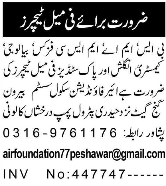 Vacant posts including chemistry teacher, physics teacher, pak studies teacher, teacher, biology teacher and english teacher are announced in Air Foundation School System Peshawar, peshawar Khyber Pakhtunkhwa KPK Pakistan as per 6 December 2025 advertisement in daily Aaj Newspaper. M.sc, Master, MA and Bachelor etc. educational qualification will be preferred.