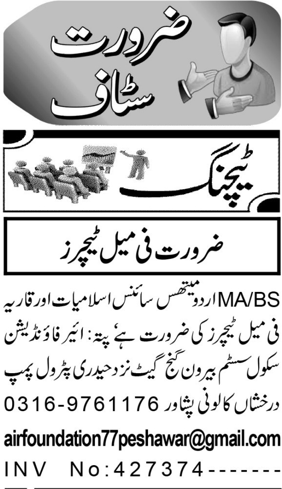 Air Foundation School System is looking for candidates for following posts as per job advertisement published in daily Aaj Newspaper of December 16, 2023 for location Peshawar, peshawar Khyber Pakhtunkhwa KPK Pakistan: