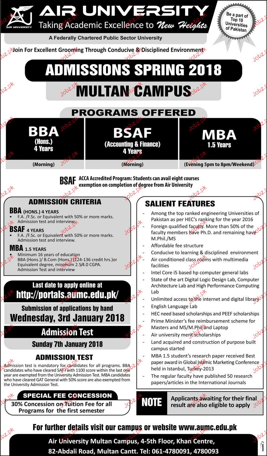 Air University Admission in BBA Honor Four Year Progam, BSAF Accounting & Finance Four Year Program and MBA 1.5 Year Program in Multan. Last date is 03 January 2018. Read newspaper ad for exact details.