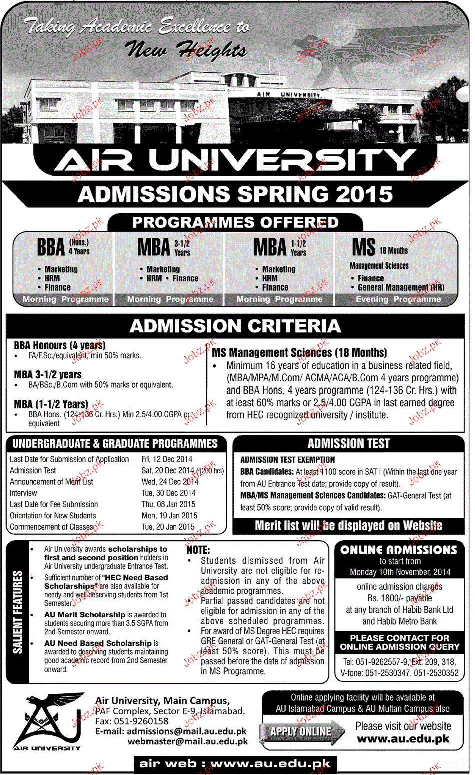 Air University Admission in BBA, MBA and MS in Islamabad. Read newspaper ad for exact details.