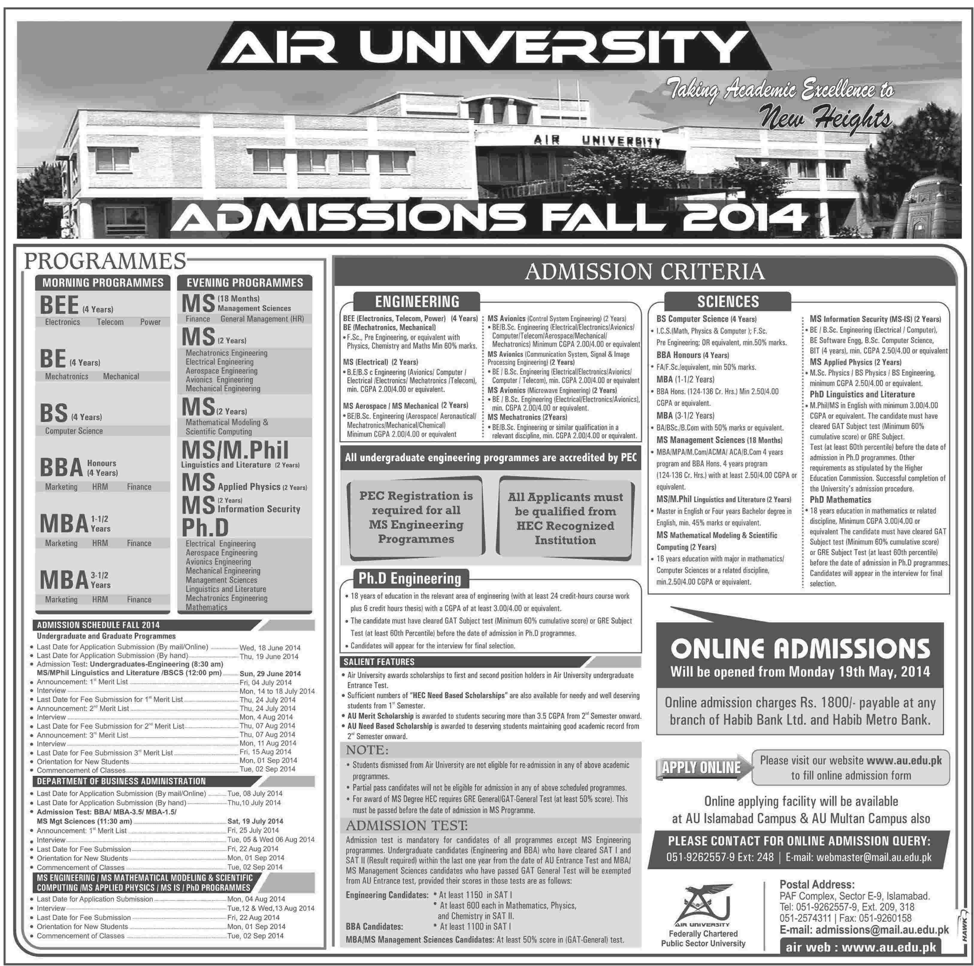 Air University Admission in BEE, BE, BS, BBA, MBA, MS, Mphill and Phd in Islamabad. Read newspaper ad for exact details.