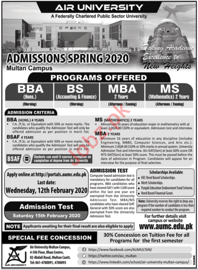 Air University Multan Campus has announced admissions for Bachelor of Business Administration BBA Hons, BS Accounting, BS Finance, Master of Business Administration MBA & MS Mathematics. Read newspaper ad for exact details.