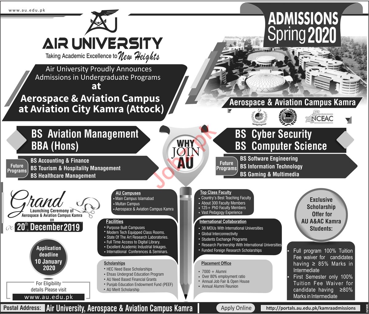 Air University Aerospace & Aviation Campus Kamra, Pakistan are opening admissions spring 2020 for the classes of BBA Hons, BS Aviation Management, Cyber Security, Computer Sciences. Read newspaper ad for exact details.