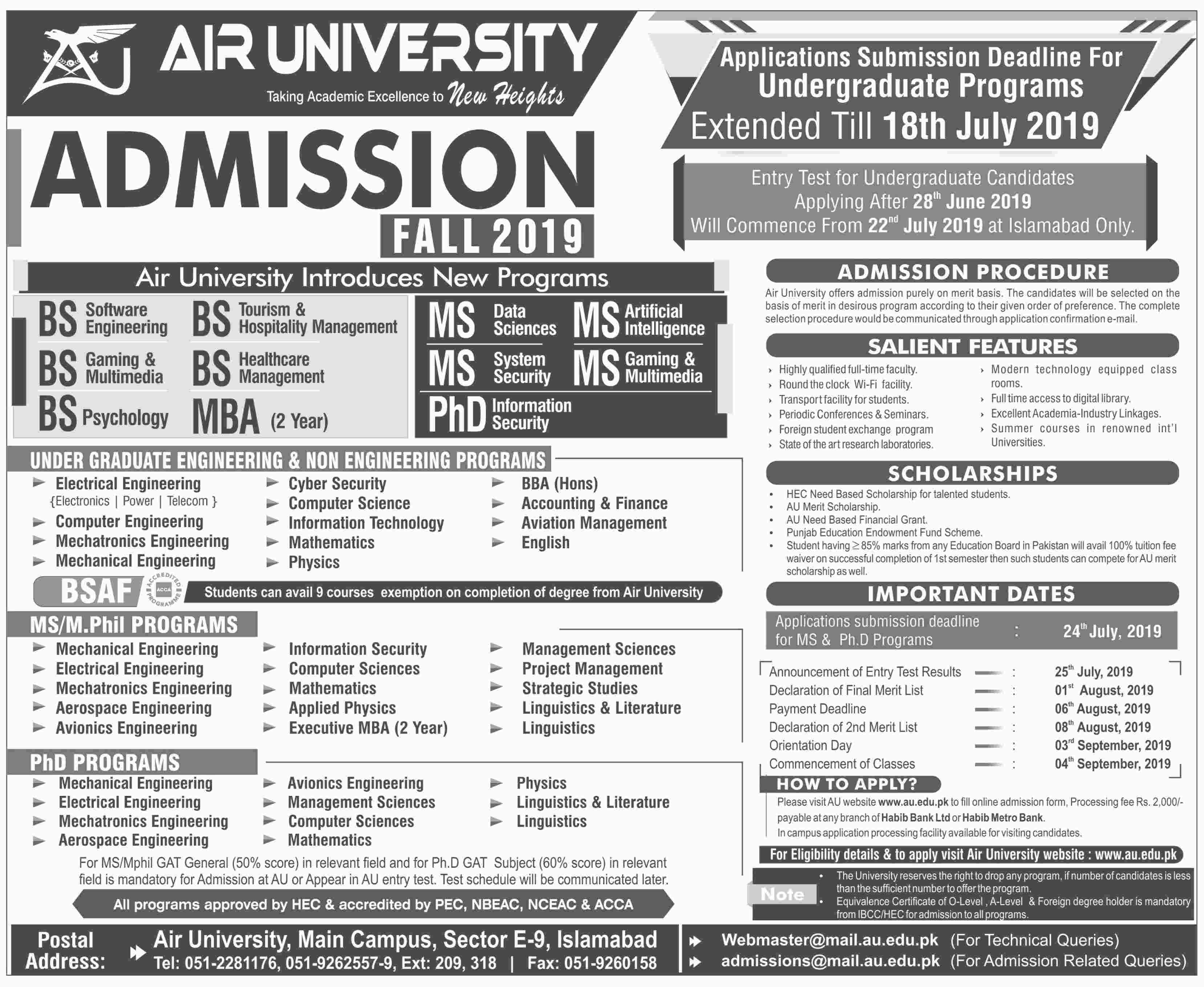 Air University AU Islamabad, Pakistan Air Force PAF, Pakistan are started admissions fall 2019 for the classes of BS, MS, BBA Hons, BE, MBA, M Phil & PhD Information Security. Read newspaper ad for exact details.