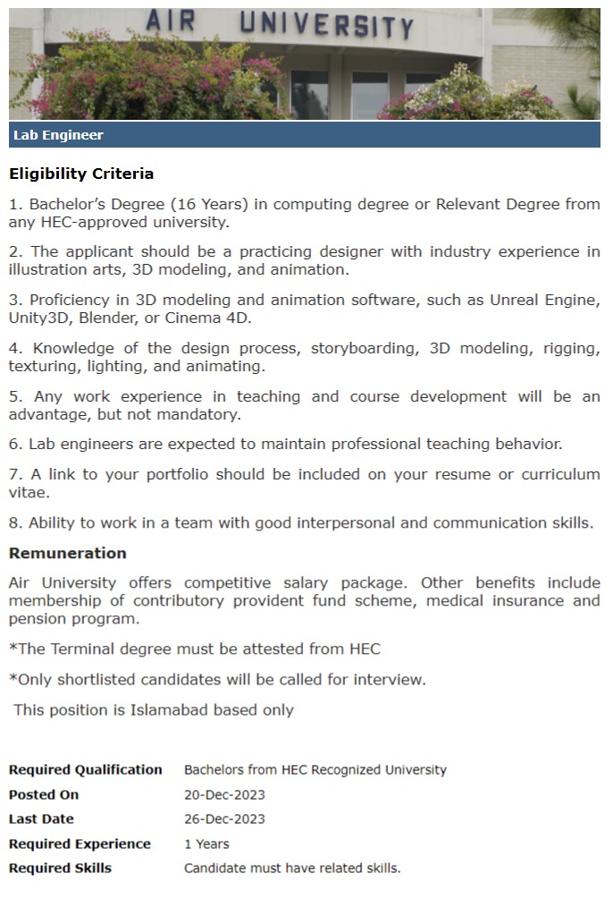 Vacant posts including lab engineer are announced in Air University Islamabad, islamabad Islamabad Pakistan as per 23 December 2023 advertisement in daily Other Newspaper. Candidates with B.E and Bachelor etc. educational background will be preferred.