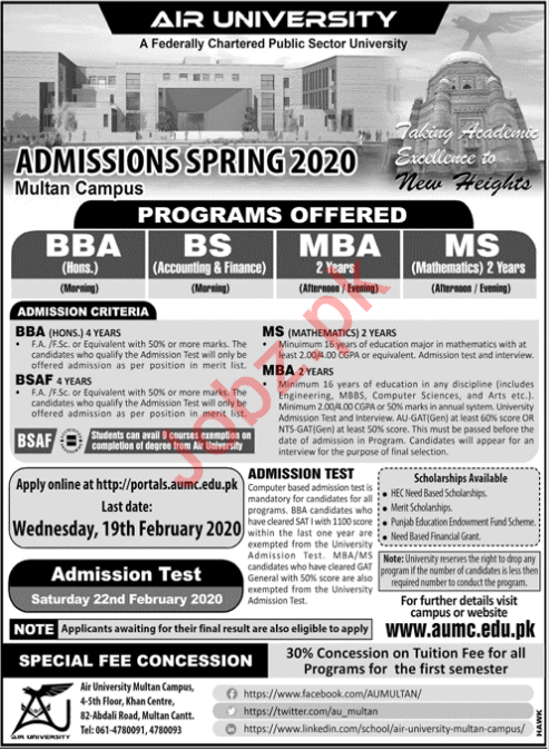 Air University established Pakistan Air Force has announced admissions for Spring Session 2020. Applications are invited for these programs BBA, BS, MBA, MS, BSAF in Multan Campus. Read newspaper ad for exact details.