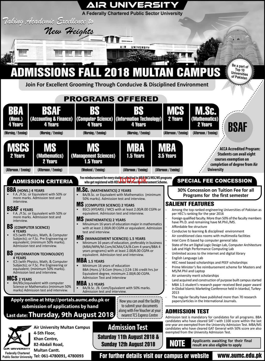 Air University Islamabad Admission in BBA, BSAF, MCS, MSc, MSC, MS, MS Mathematics Sciences, BS Computer Sciences, BS Information Sciences and MCS 2 year Program in Islamabad. Read newspaper ad for exact details.