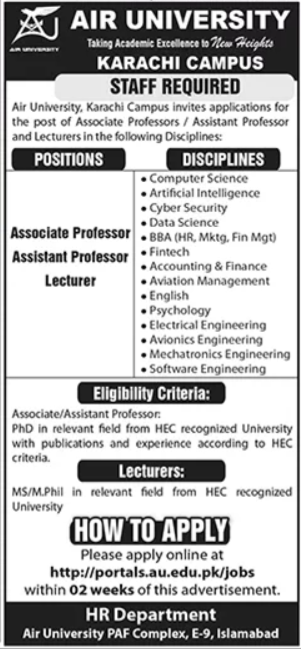 Air University is looking for candidates for following posts as per job advertisement published in daily Dunya Newspaper of June 23, 2025 for location Karachi, karachi Sindh Pakistan: