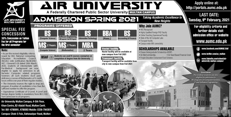 Air University is a public research university has announced admissions in BS Computer Science, BS Software Engineering, BS Information Technology, BBA Hons, MS Mathematics and MBA in Multan Campus. Read newspaper ad for exact details.