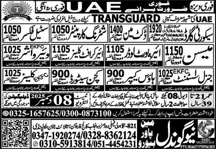 Vacant posts including ware washer, airport loader, steel fixer, general assistant, security guard, kitchen steward, shuttering carpenter, duct man, mason, house keeper, ekfc ware washer, ekfc cleaner, ekfc general assistant, aircraft cleaner and cleaner are announced in MS New Gondal Manpower Bureau OEP Abu Dhabi, sharjah UAE as per 6 December 2025 advertisement in daily Express Newspaper. Preferred Education is Bachelor, Intermediate, Matric, BA and Others etc.